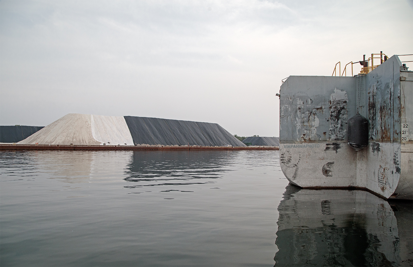 photos 20250807. The Metis Canada sits opposite the salt mounds on a serene shipping channel. A notch was cut into her stern to accommodate a tug boat. Metis was launched in 1956, lengthened in 1959, retired in Kingston in 1983, towed to Toronto in 1989 and rebuilt into a barge to service the Toronto Dry Dock. Image August 7, 2025 Vik