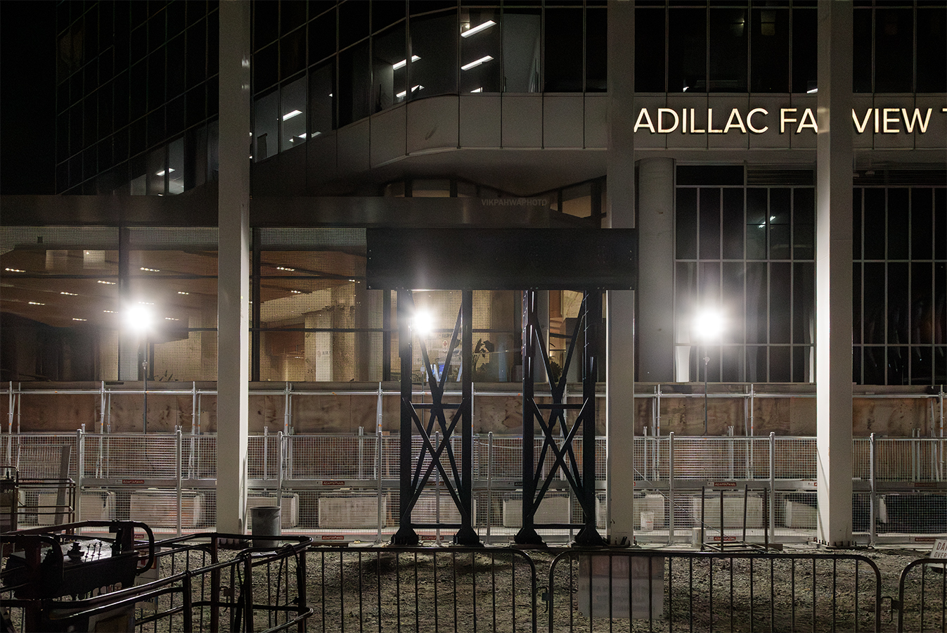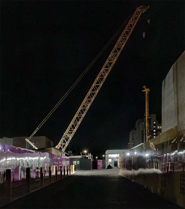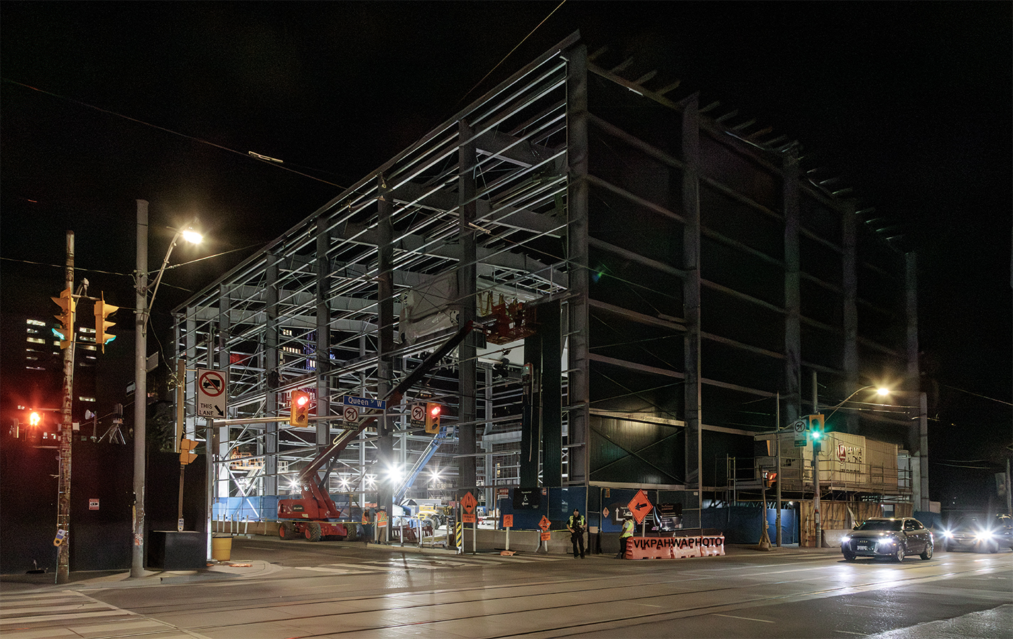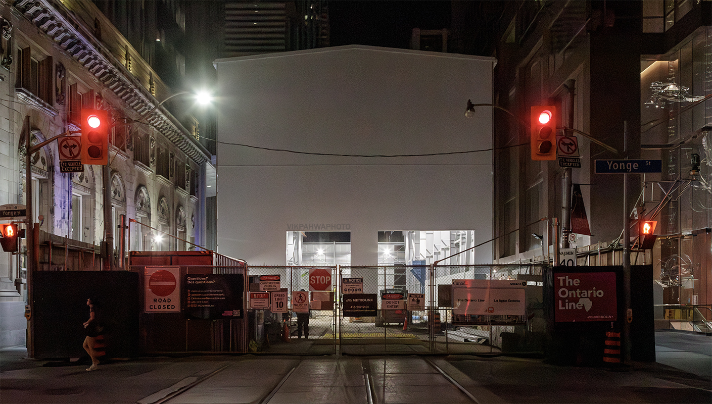 photos 20250812. Work continues at night at Queen and University under a tent frame with walls being added strip by strip. Image August 13, 2025 Vik
