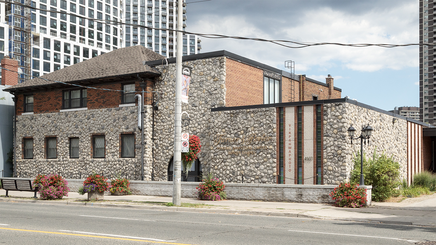 photos 20250825. A funeral home with a stunning rough stone facade bringing together a more classical building with an excellent modernist addition. Just look at those veritcal stained glass windows to the right! Image August 26, 2025 Vik